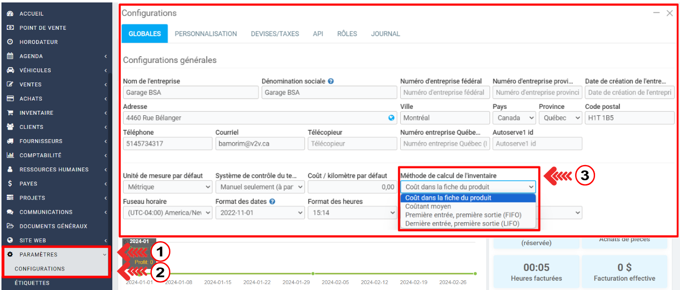 Cliquez sur le menu de gauche, Paramètres > Configurations > onglet Globales, cliquez sur la méthode de calcul de l'inventaire et sélectionnez l'une des options.
