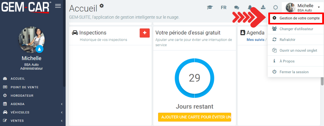 Dans le menu de votre avatar en haut à droite (où vous trouverez votre nom), vous pouvez gérer votre compte.