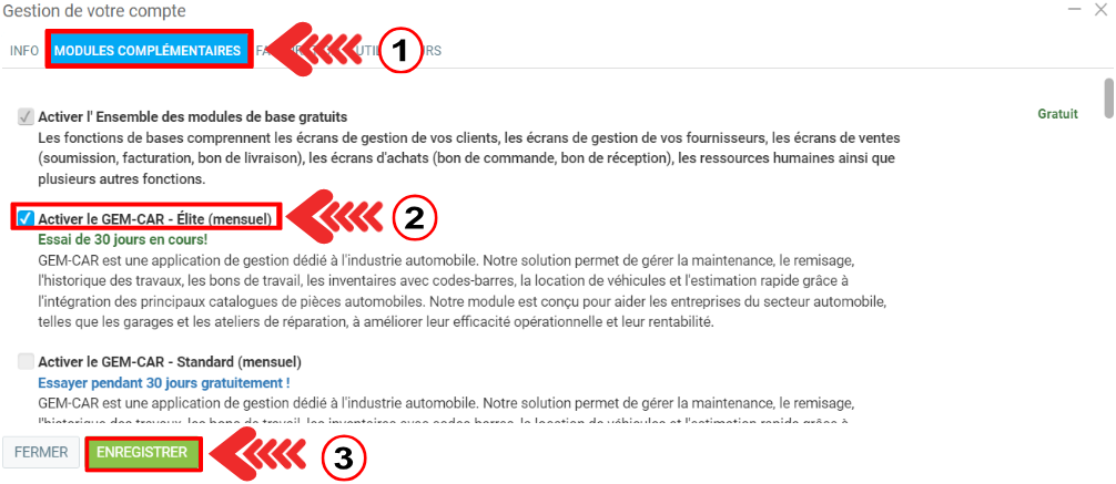 Les modules complémentaires sont ensuite facturés dans l'onglet Facturation de votre compte.