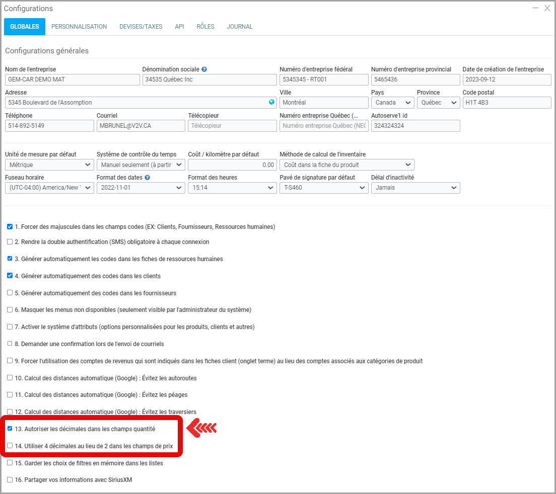 Pour modifier le nombre de décimales à utiliser pour les quantités et le prix, à partir du Menu principal situé à gauche de l'application, cliquez sur Paramètres > Configurations > onglet Globales.