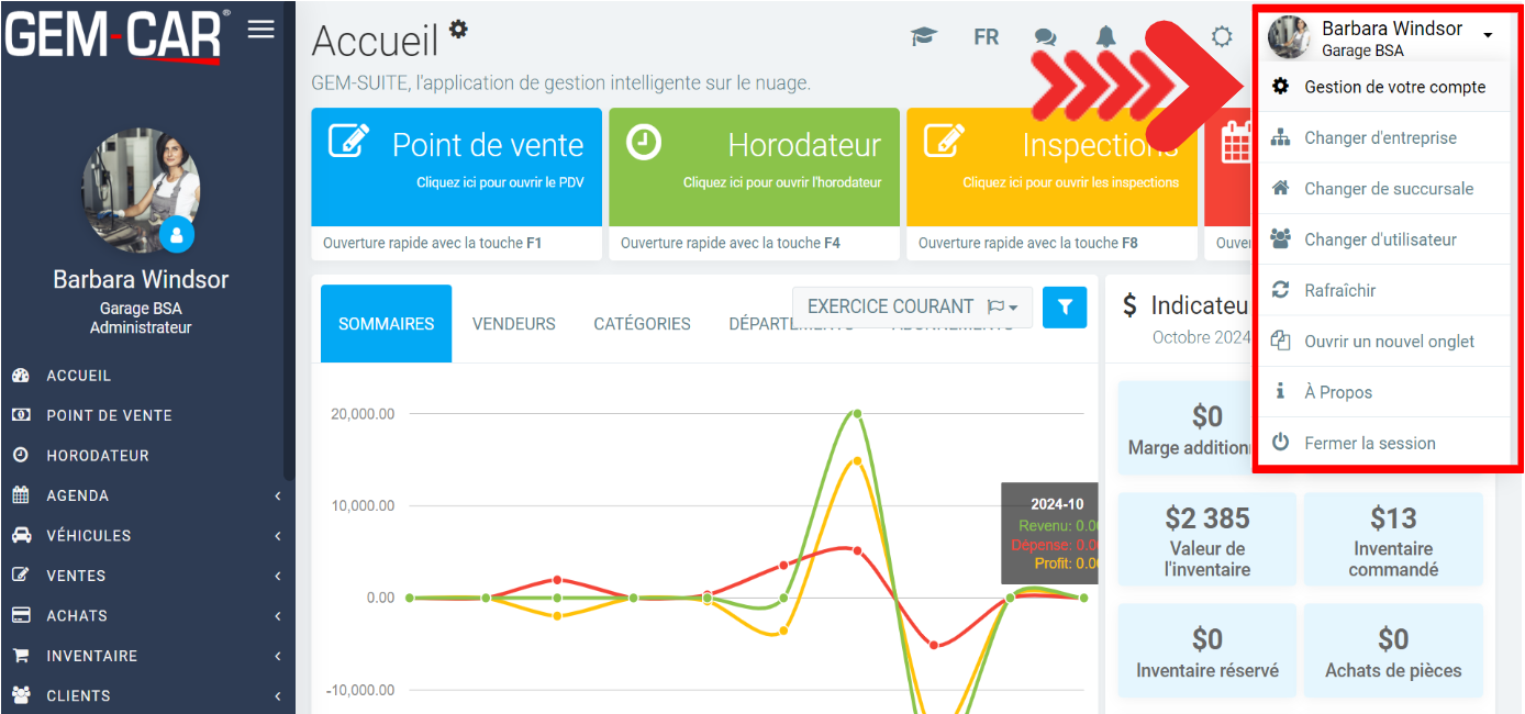 Cliquez dans le coin supérieur droit sur la flèche située à côté du nom de l'entreprise et cliquez sur Gestion de votre compte.