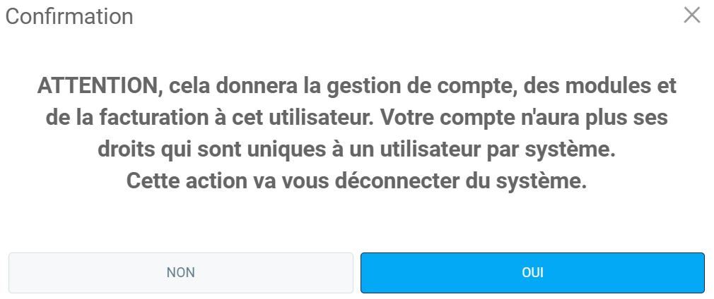 Une fenêtre de confirmation apparaîtra avec le message suivant: "ATTENTION, cela donnera la gestion de compte, des modules et de la facturation à cet utilisateur. Votre compte n'aura plus ses droits qui sont uniques à un utilisateur par système. Cette action va vous déconnecter du système."