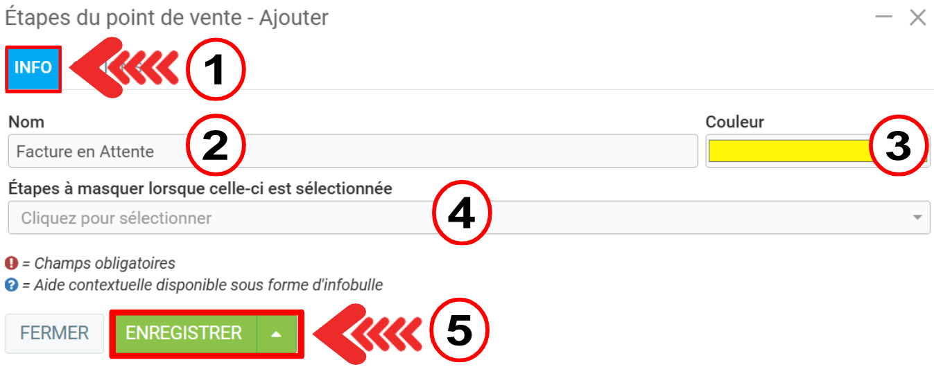Pour créer de nouvelles étapes, cliquez sur + Nouveau. Dans l'onglet Info, entrez les informations suivantes:
