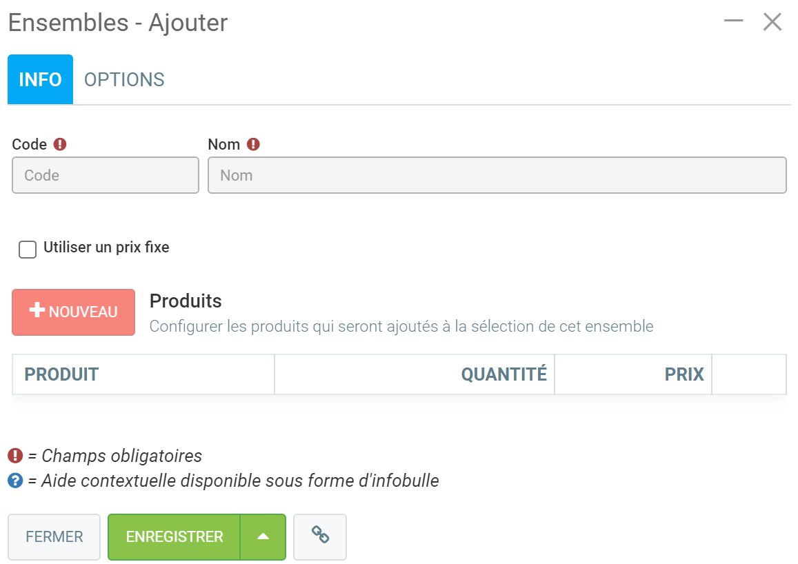 Pour ajouter des produits à un ensemble, cliquez sur +Nouveau.