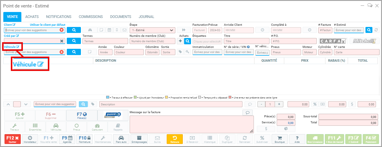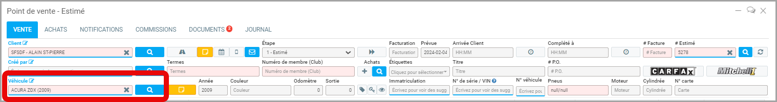 Note: Lorsque vous modifiez des informations sur un véhicule, rappelez-vous que vous ne les modifiez pas seulement dans la vente en cours, mais plutôt dans la fiche du véhicule. Par conséquent, si vous démarrez une nouvelle vente avec ce même véhicule, les nouvelles informations s’afficheront.