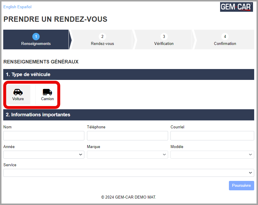 - Sous l'onglet Info de la baie, choisissez le Type de véhicule pour lequel vous offrez les services. Ils seront affichés dans le menu de réservation de rendez-vous sur votre site Web.