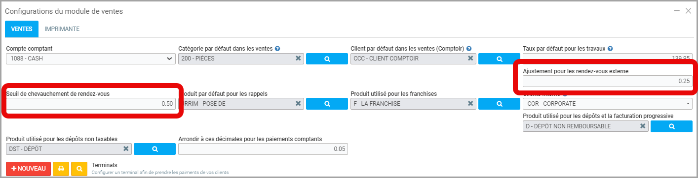 L'ajustement donne l'espacement réservé entre deux rendez-vous et le chevauchement permet de réserver un rendez-vous pour une certaine période avant que le rendez-vous précédent ne soit terminé. On met habituellement 0 pour le chevauchement pour ne pas qu'il y ait de conflits entre les rendez-vous.