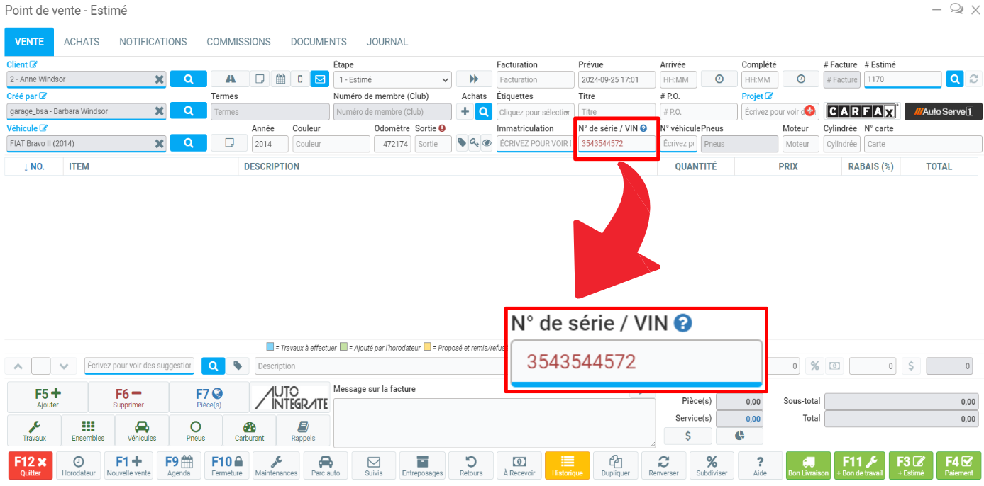 Lorsque vous ouvrez le Point de vente, après avoir sélectionné le client et son véhicule, vous pouvez remarquer que le Numéro de série/VIN a des couleurs différentes: vert ou rouge.