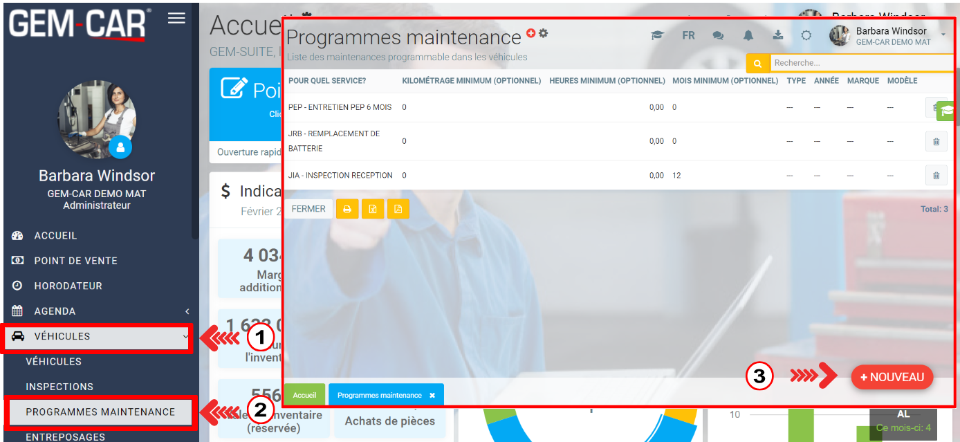 Les programmes de maintenance servent à créer des rappels, dans le dossier du véhicule, afin de planifier et créer les entretiens qui sont à faire sur une base régulière. Une fois le programme de maintenance associé à un véhicule, l'aviseur pourra voir des rappels lorsqu'il consultera le dossier du véhicule et pourra offrir au client de prendre rendez-vous pour effectuer les maintenances.