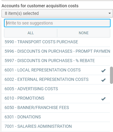 Note: For accounts for customer acquisition costs, you can select multiple GLs. Sales costs are usually in the 6000s.