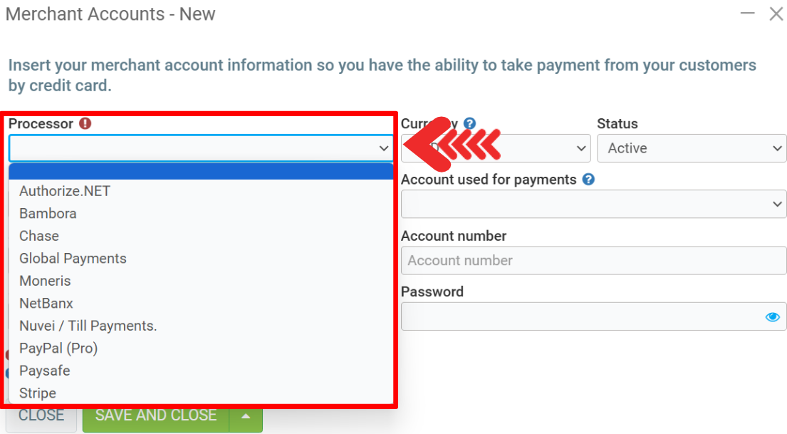 - Account number: Your unique account number with your payment provider (not mandatory for some processors).
