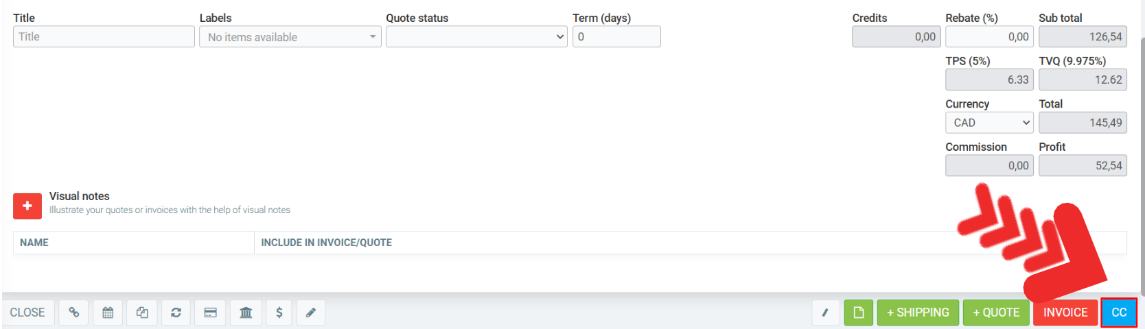 A new CC button should now be displayed next to the button. It allows you to make a credit card payment manually.