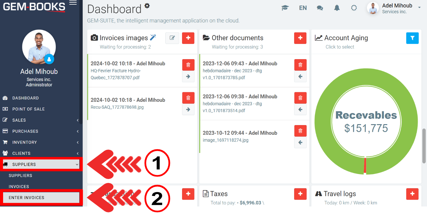 To transfer your invoice photos to accounting, click on the paper and pencil icon in the top right-hand corner of the Invoice Photos module box on the home page, or click on Suppliers > Enter invoices.