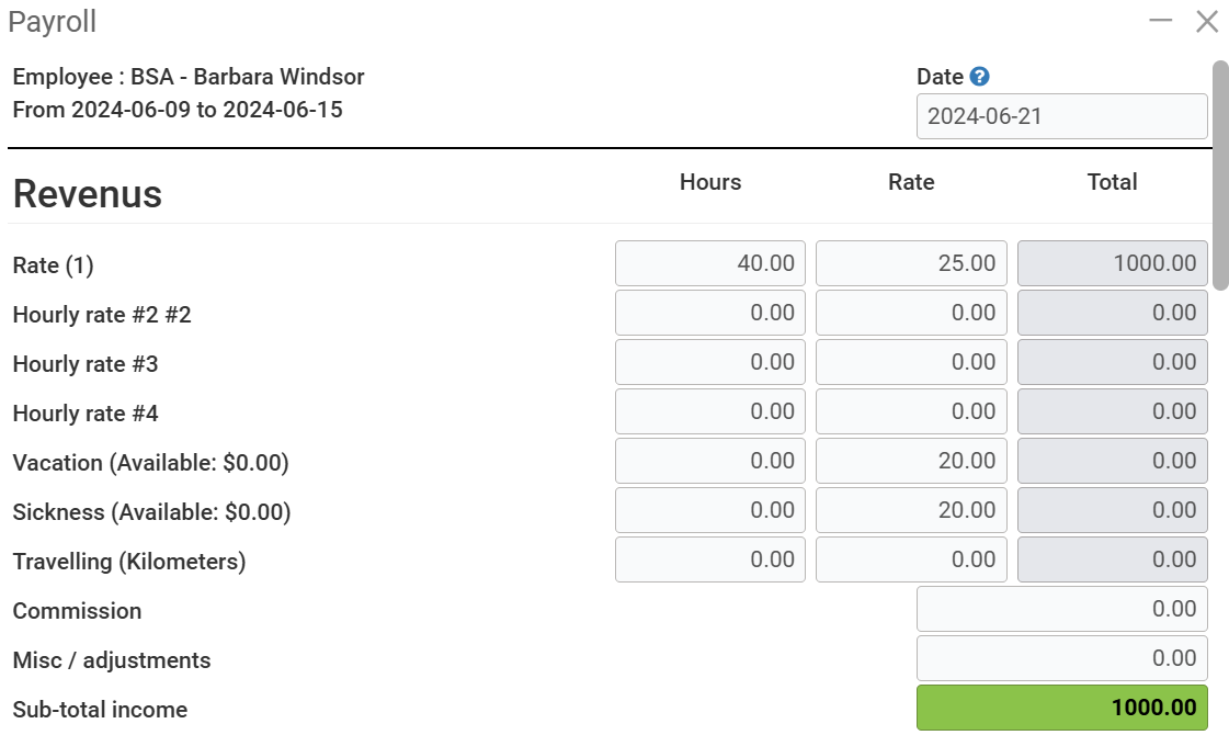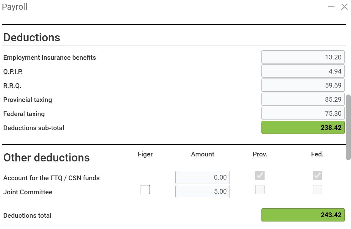 Next, in the payroll screen, you'll notice that some fields are highlighted in green. These are the fields reserved for CCQ payrolls. They will only be displayed if the employee has a CCQ-related category. The first block is the Revenus block: