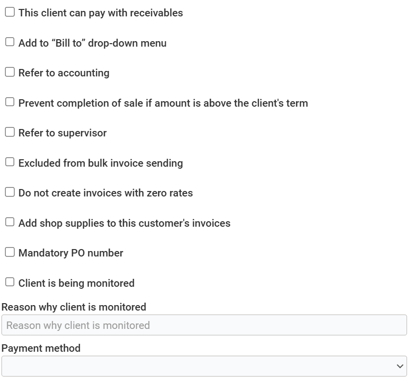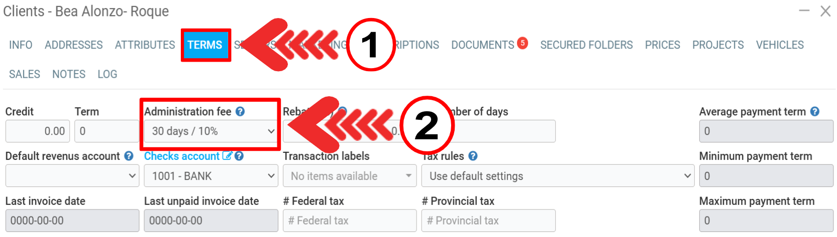 To check this feature, click on Clients > Clients and select the file you wish to open. Click on the Terms tab.