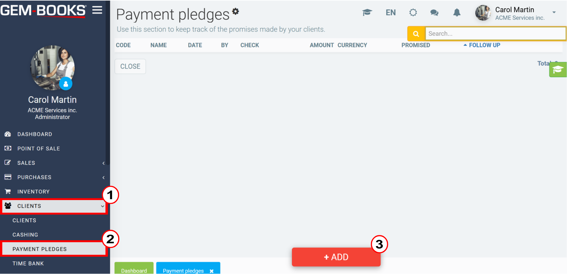 Click on Clients > Clients and select the client to enter or verify the payment pledge.