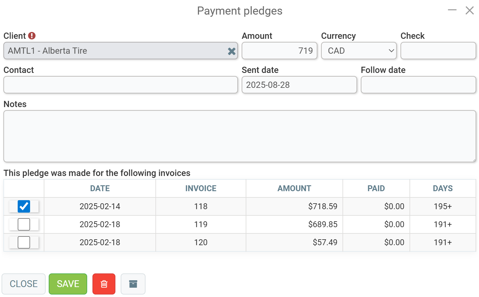 The page will display the details of the client’s unpaid invoices and, at the bottom of the page, you will find the Payment Pledge menu.