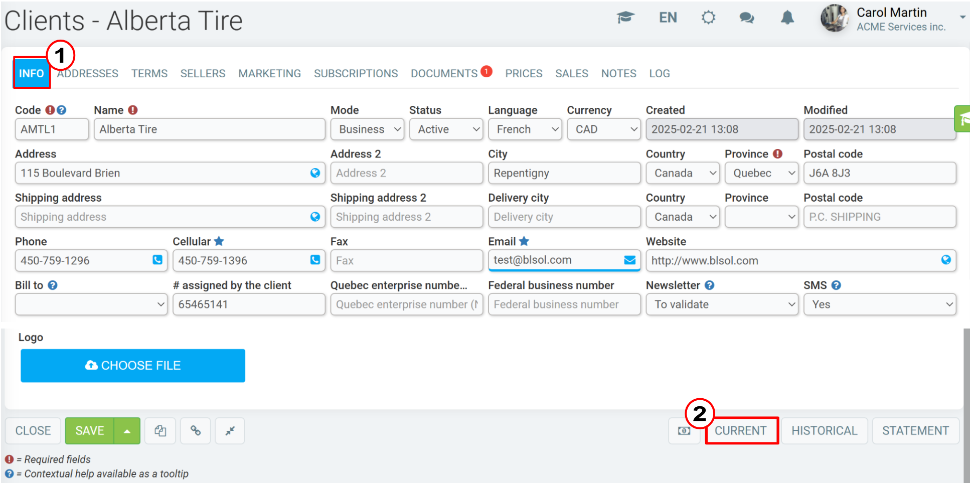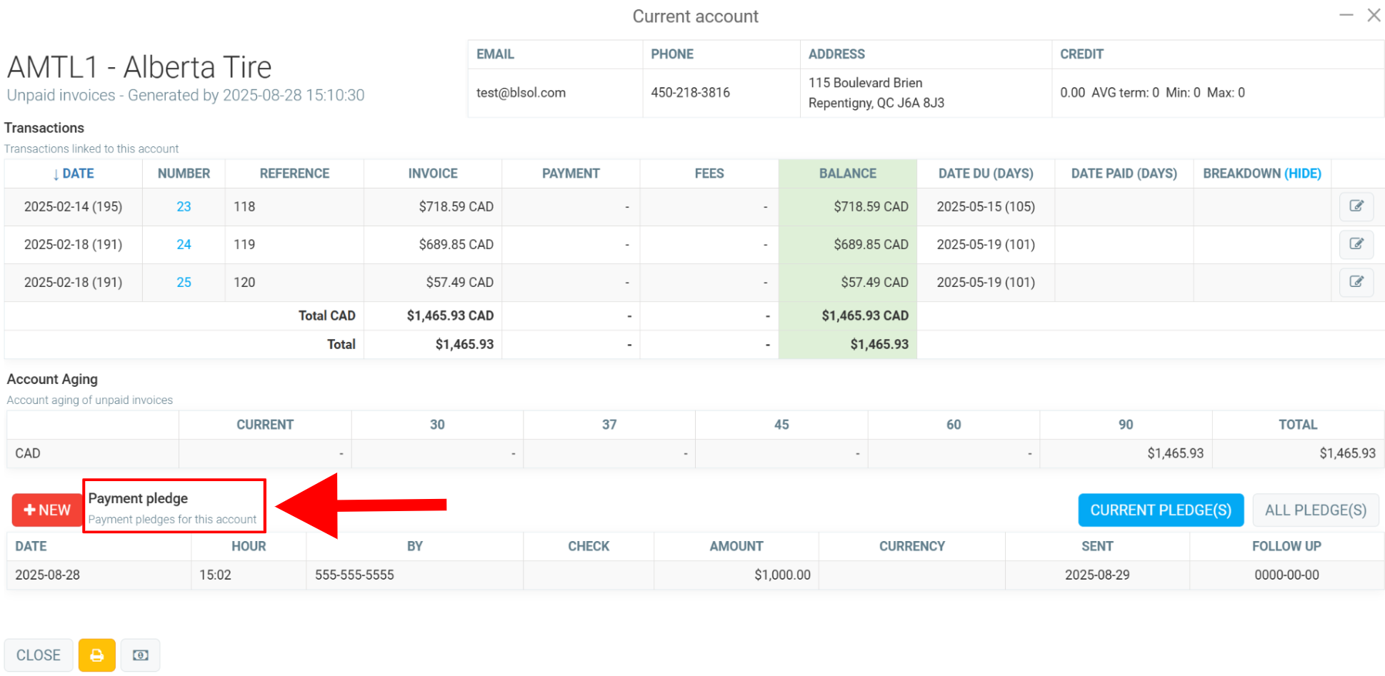 The payment promise system makes it easy to track your clients' payment commitments. You can access it in two ways: via the Clients > Payment Pledges menu or directly in the Current report on a client's file. This module centralizes all invoices for which a client has made a payment promise and allows you to enter and view this information quickly and easily.