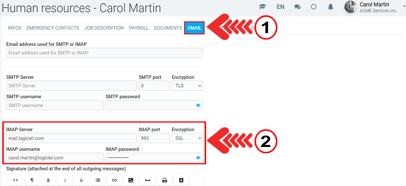 You need to enter GEM-BOOKS IMAP connection information in the file of the human resource for which you wish to synchronize exchanges.
