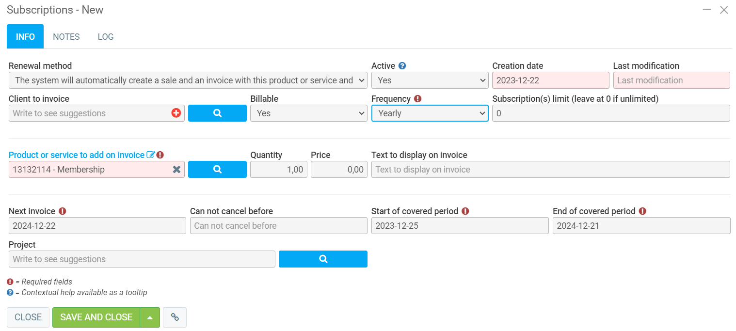As a conclusion, if you had wanted the coverage interval displayed on the invoice to be from December 25, 2023 to December 24, 2024, you would have had to indicate December 23, 2022 to December 24, 2023 on the first screen since the system adds 1 year before creating the subscription.