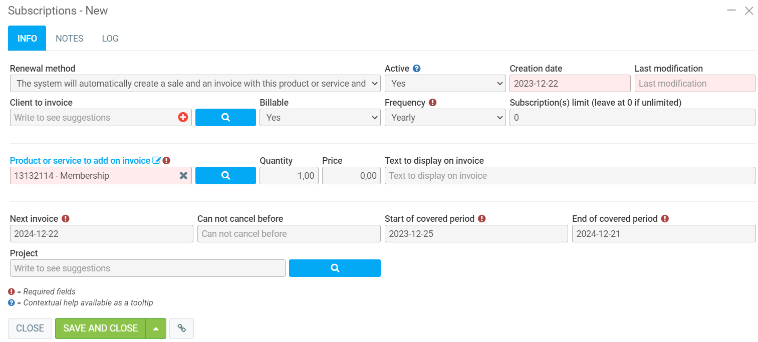 Note that the system added 1 year to the three dates before generating the sale. If you open the subscription on December 21, 2023, you will get this: