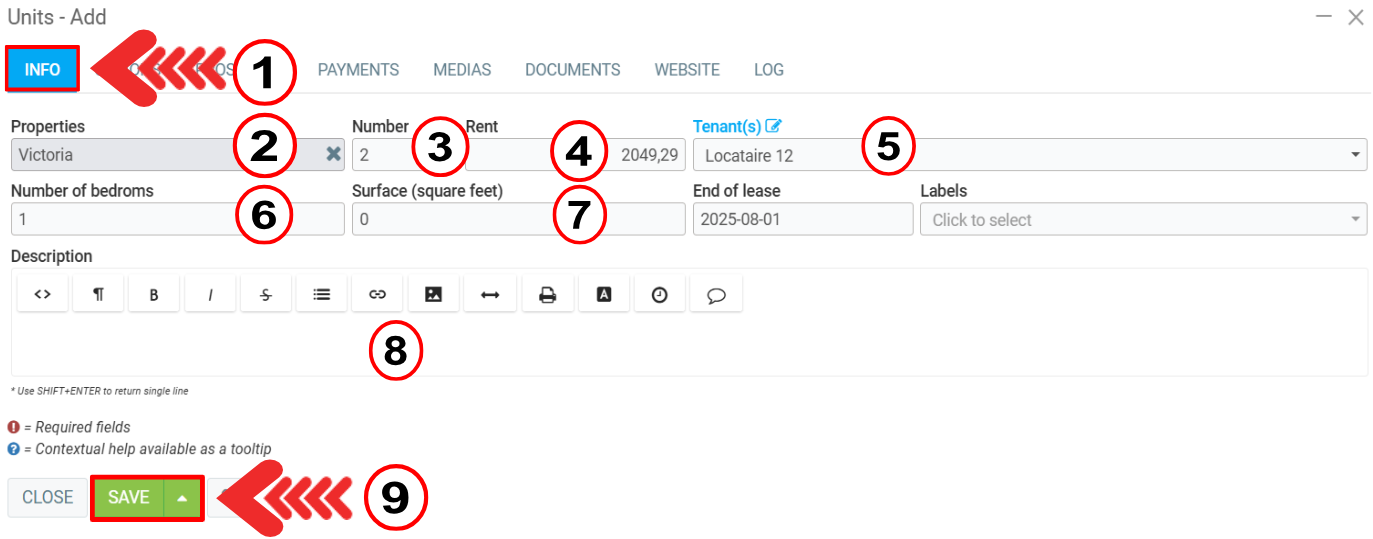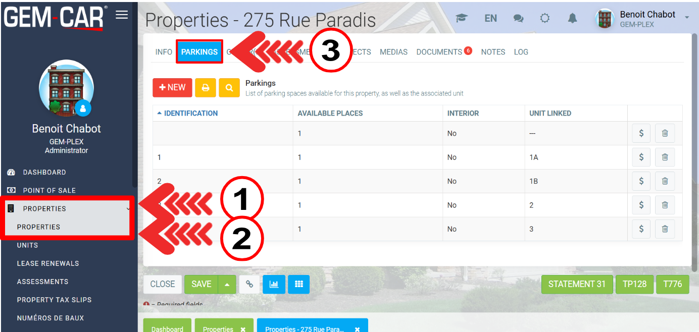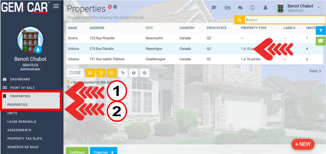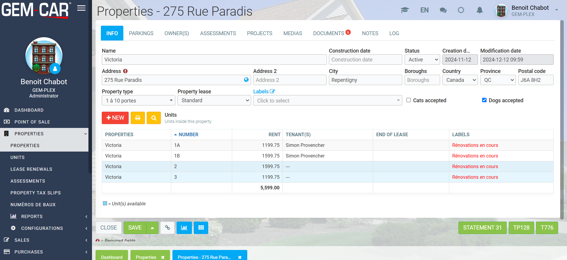When we click on a property, we'll have access to several tabs concerning it, starting with general information (addresses, name, etc.) and the units it contains.