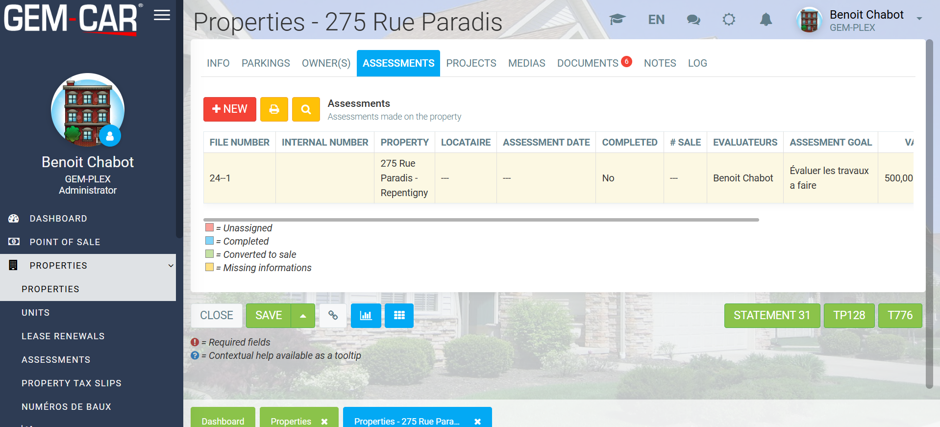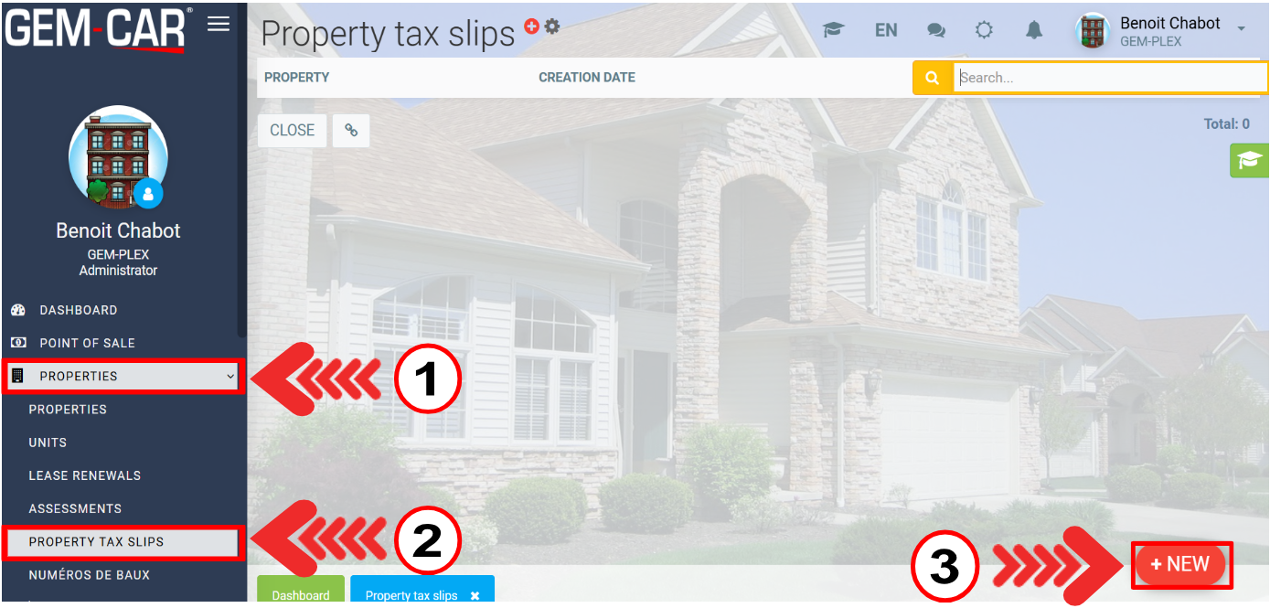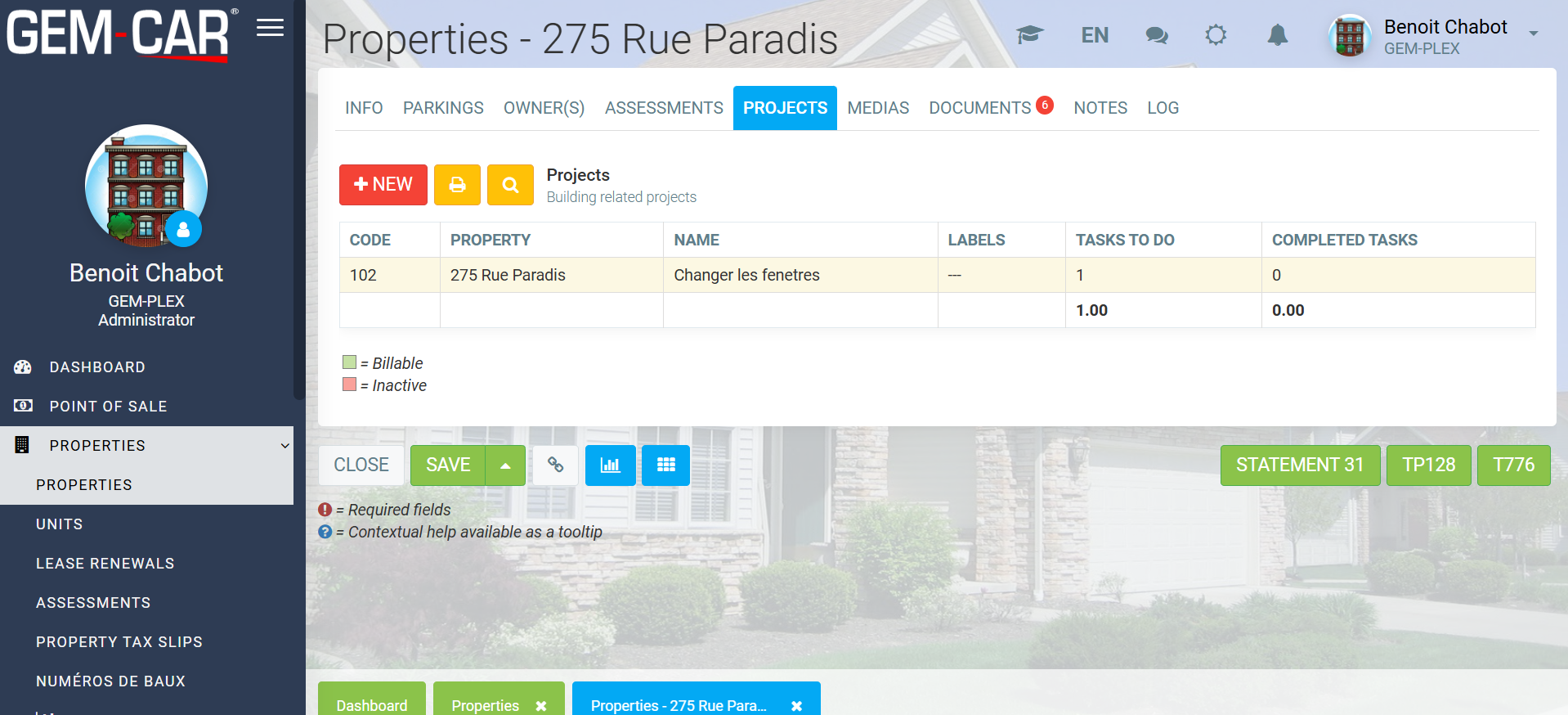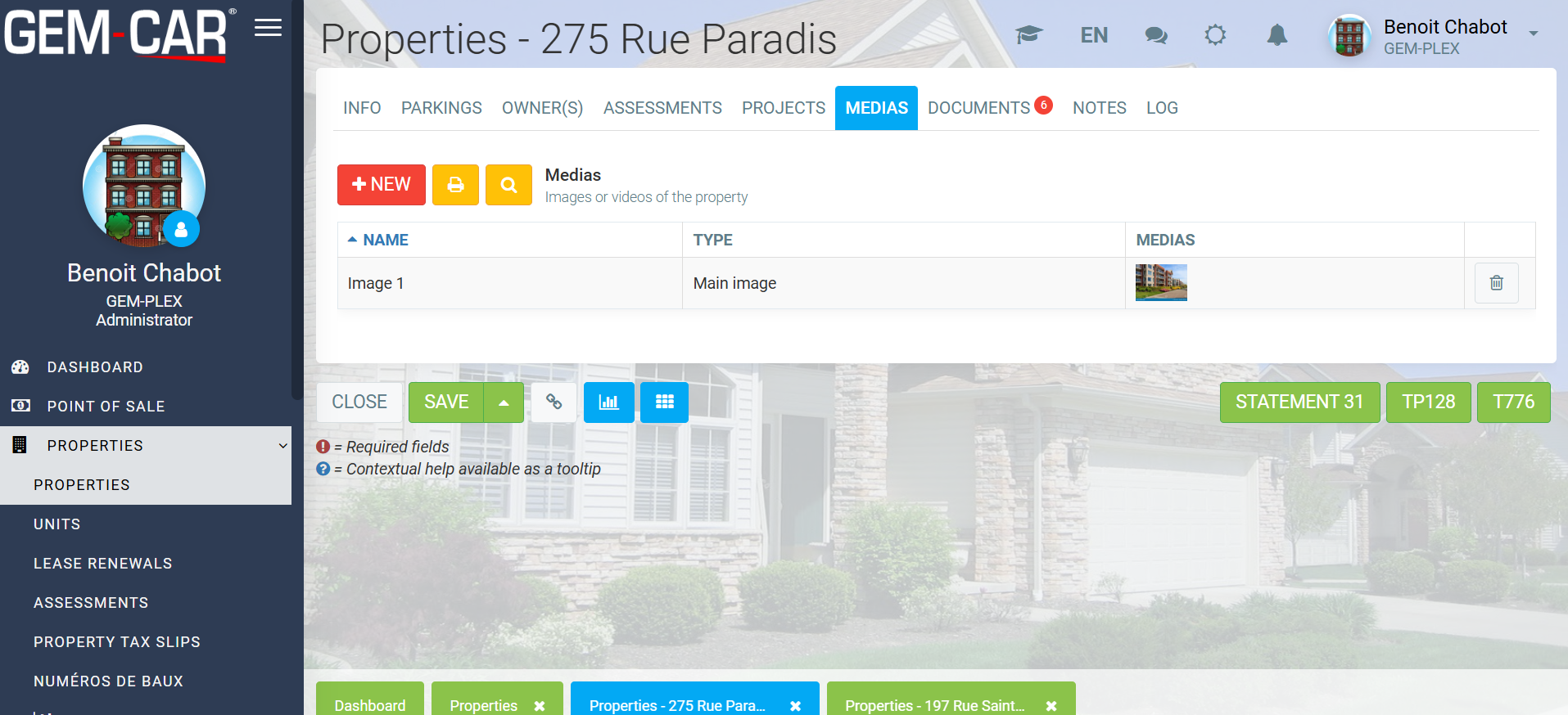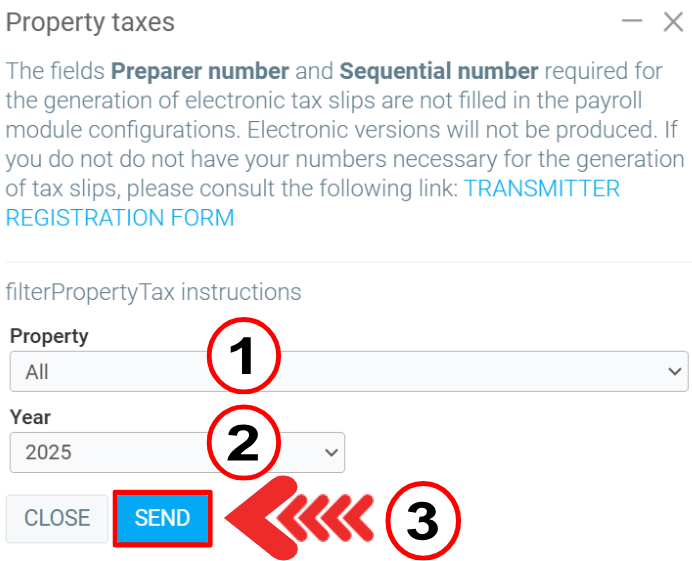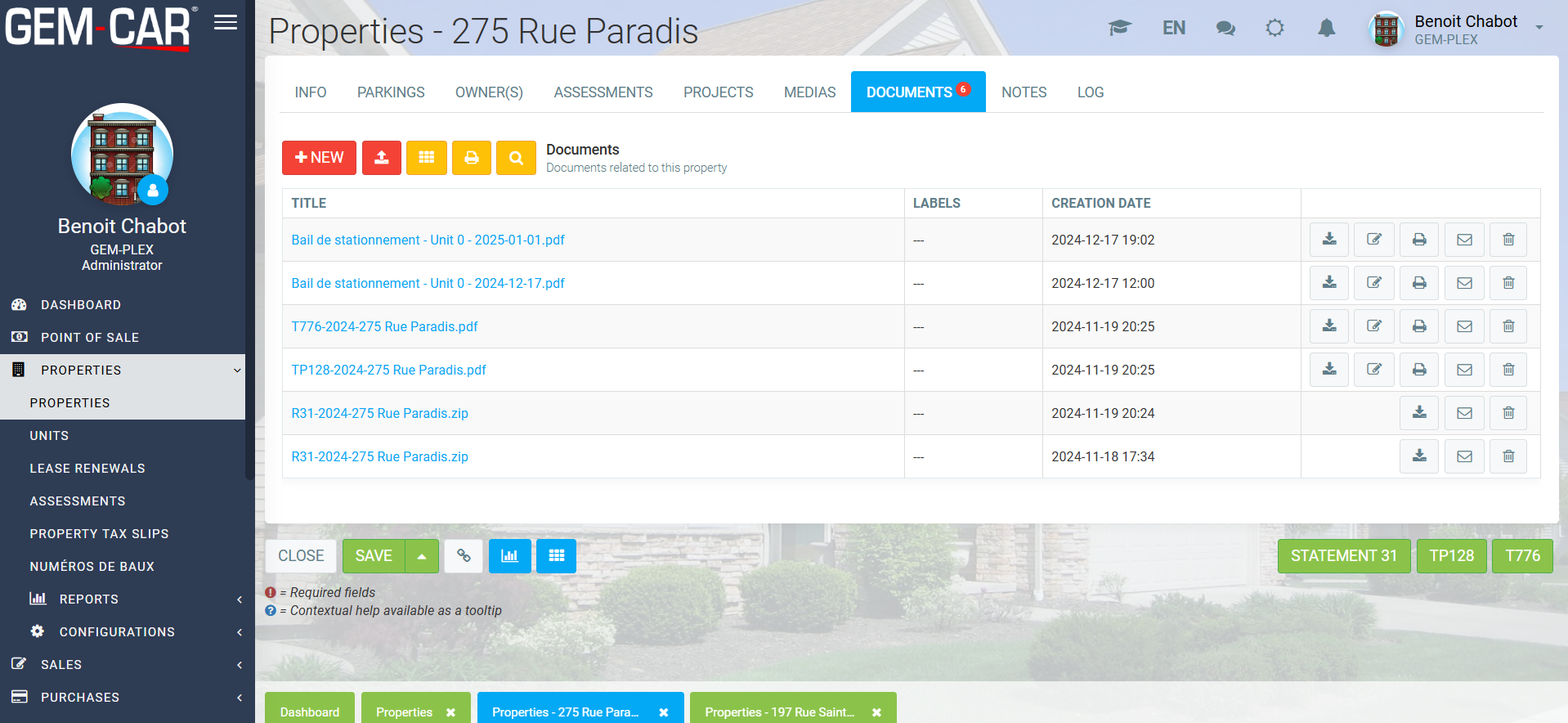 The menu Properties > Tax slips > +New allows the administrator to generate the documents required for year-end, including the Statement T776.
