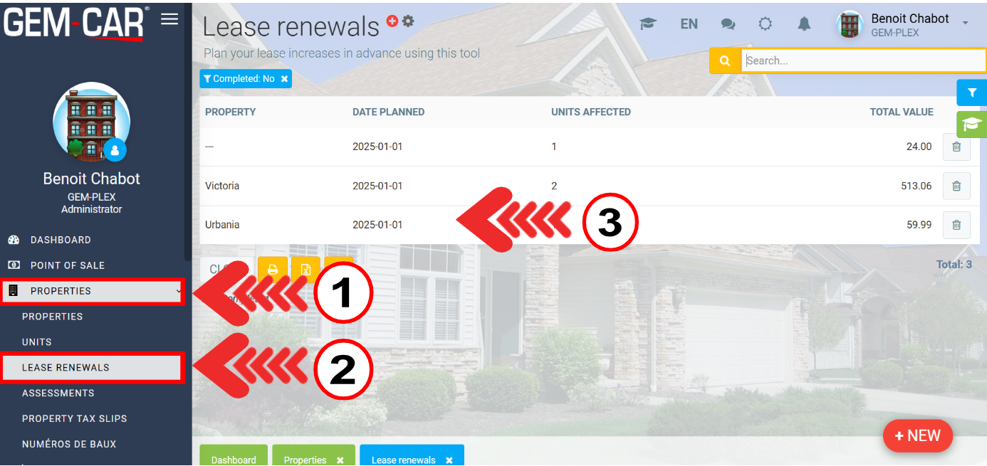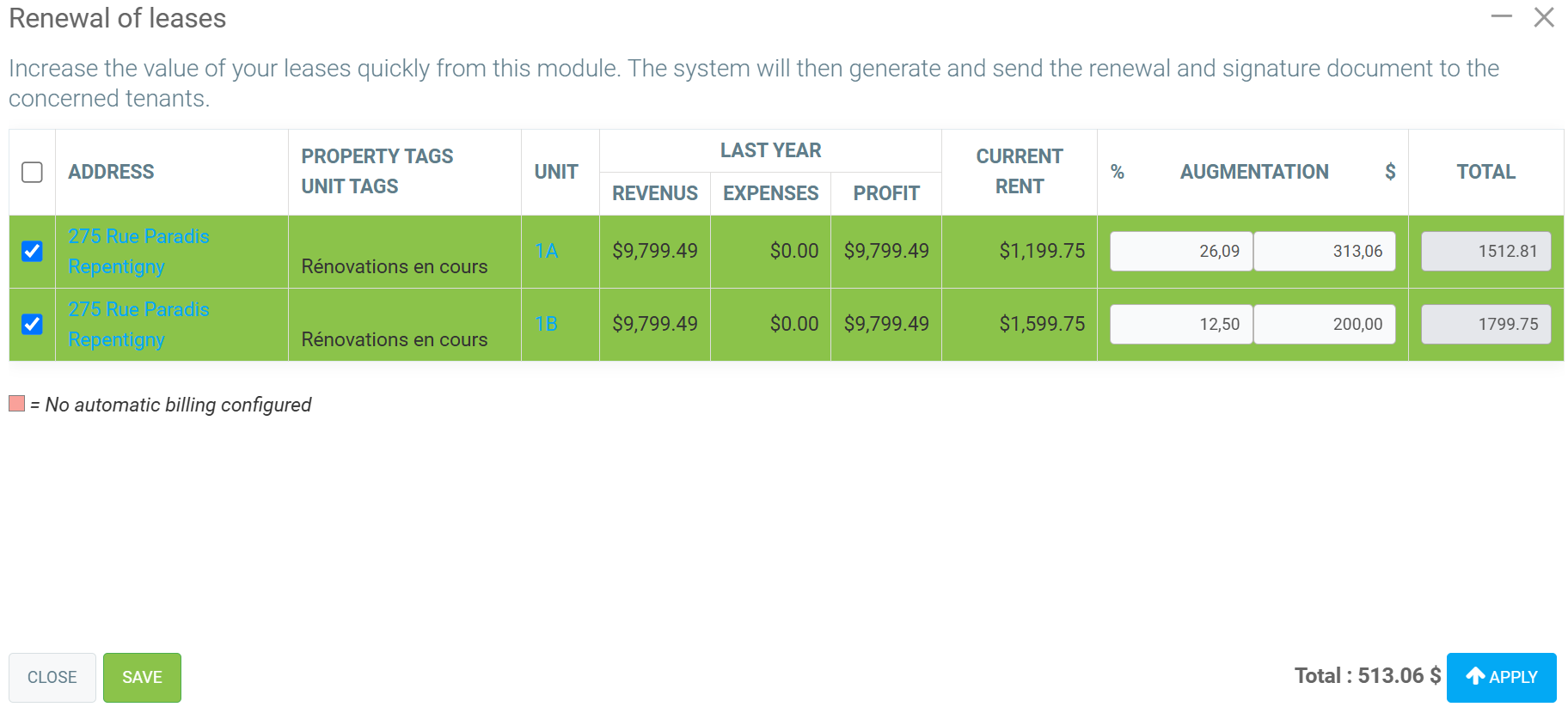 In the Properties > Lease renewals menu, you can prepare lease renewals and view their history.