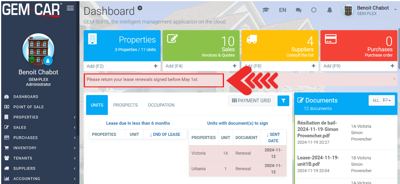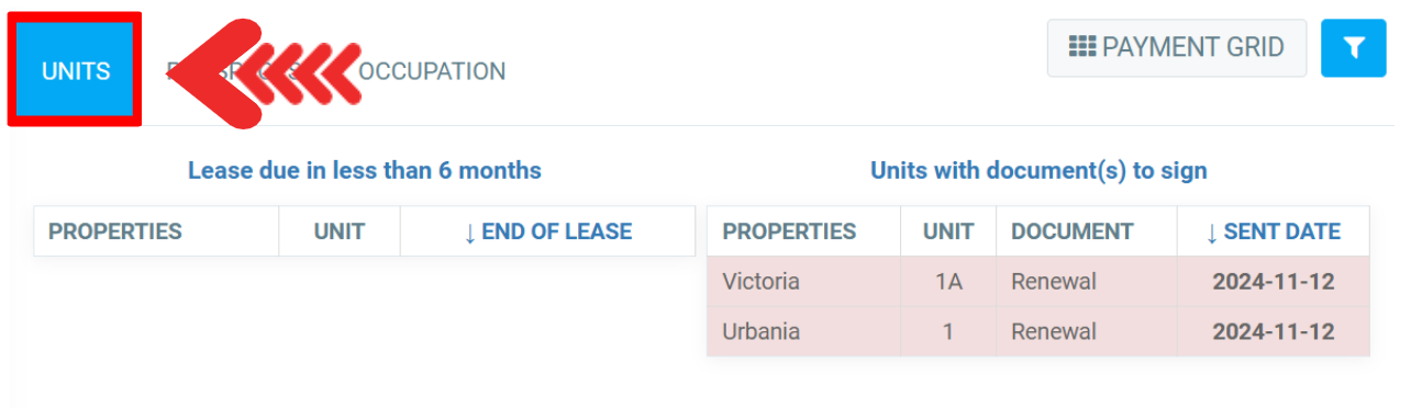 First tab (Units): This tab shows units with leases expiring soon, i.e. up for renewal. On the right, you can also see units with documents awaiting signature.