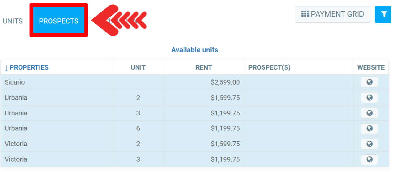 Second tab (Prospects): This tab shows the units that currently have no tenants, with the prospects on their sheet. On the right, a shortcut to the website page is accessible.