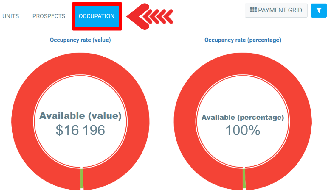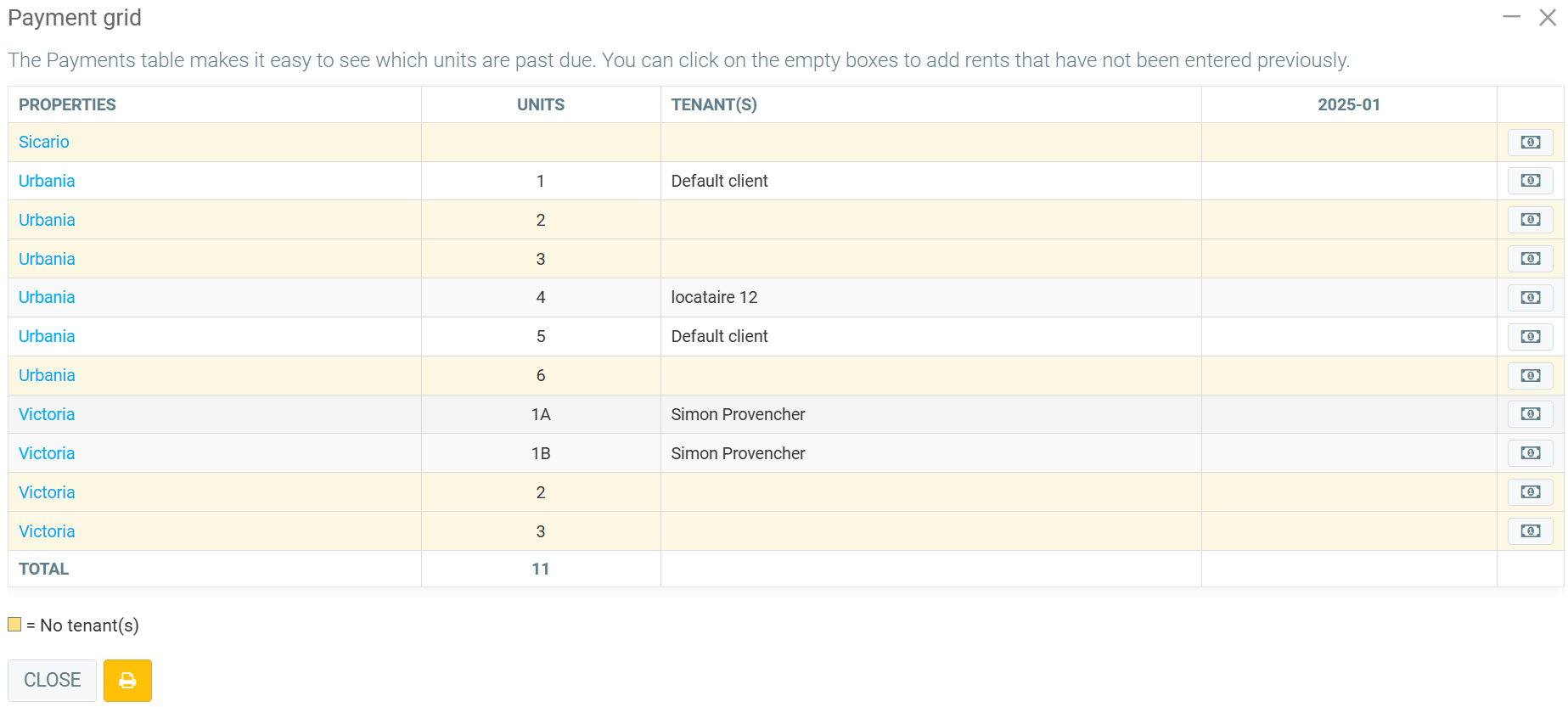 - Payment grid: The payment grid is very useful for getting an overview of the package with the amounts not yet paid, as well as those to come. This interface also allows you to add rents from previous months if you have forgotten to do so.