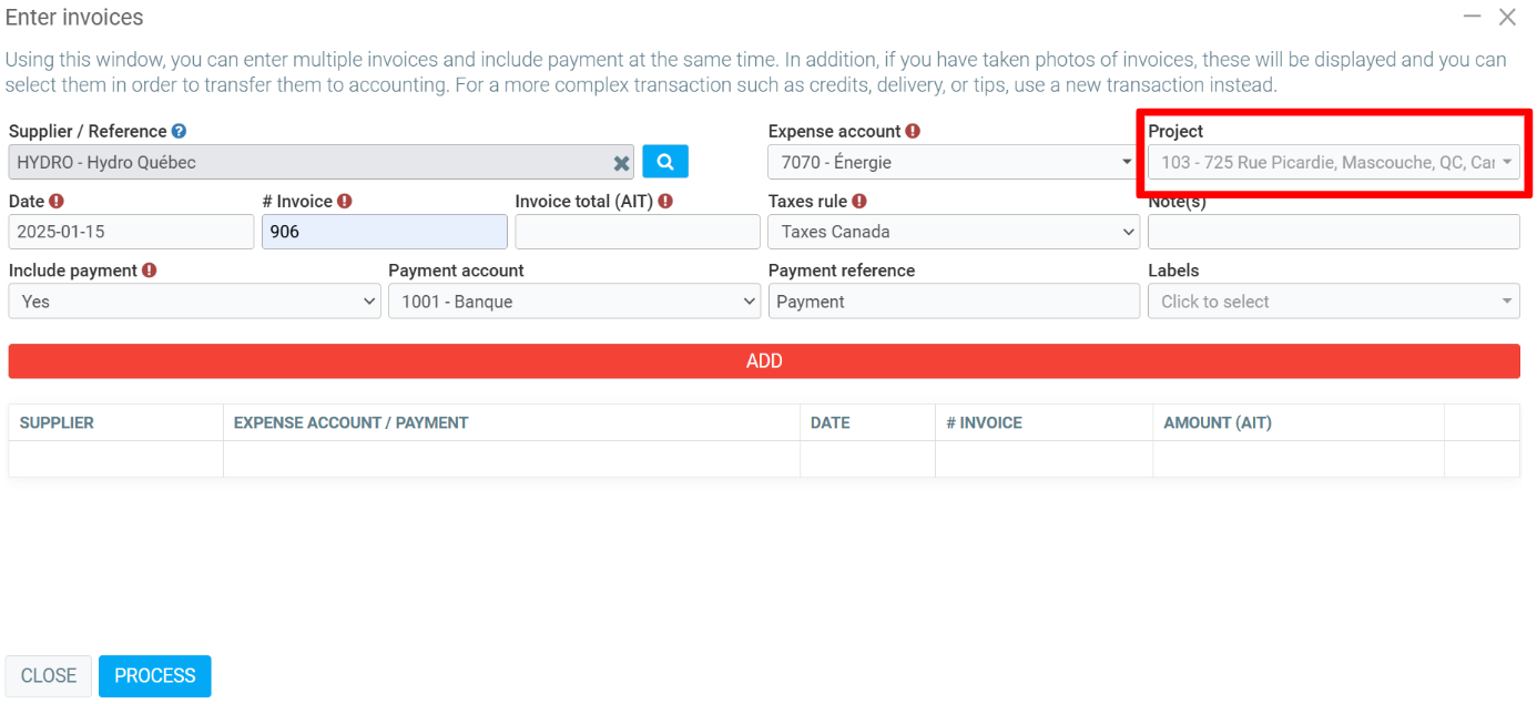 Invoice registration with projects: In the invoice registration interface, you can now link a project directly to the expense (available to all, not just GEM-PLEX).