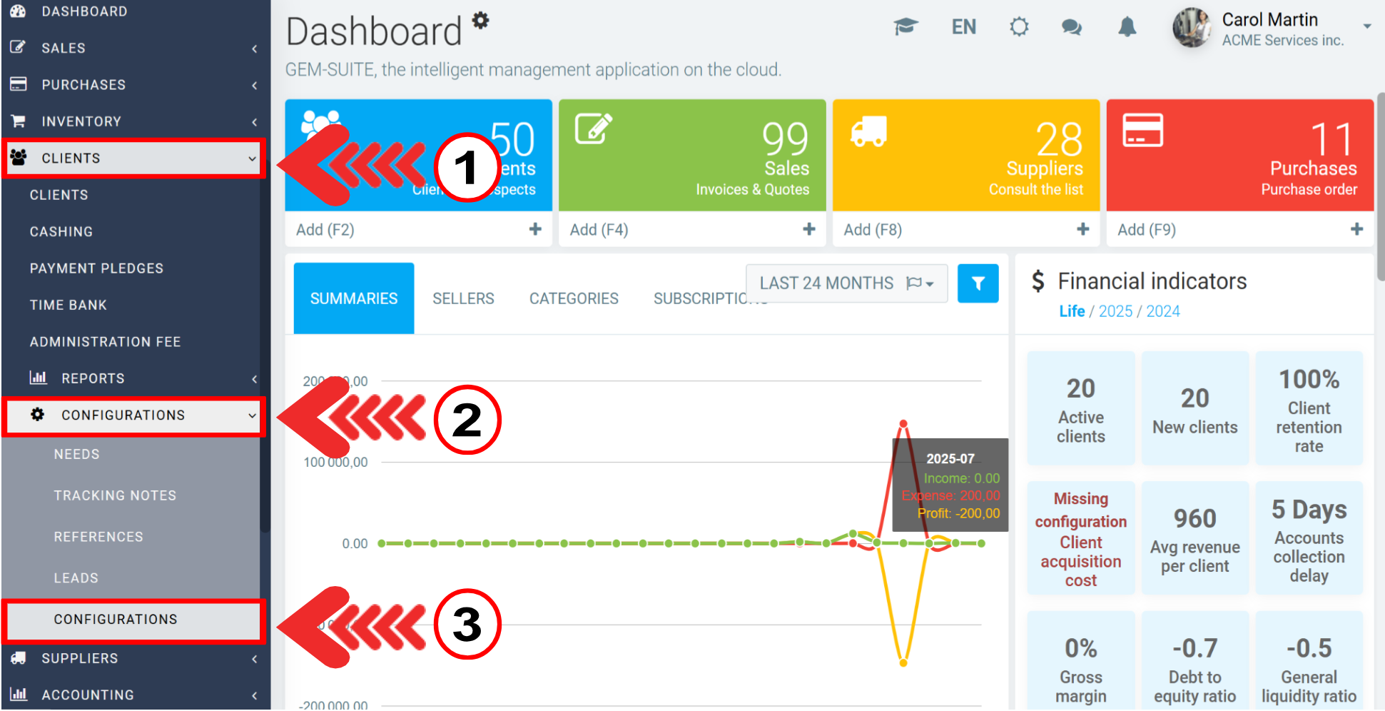 To configure this function, click on the menu on the left, on the tab Clients > Configurations > Configurations.