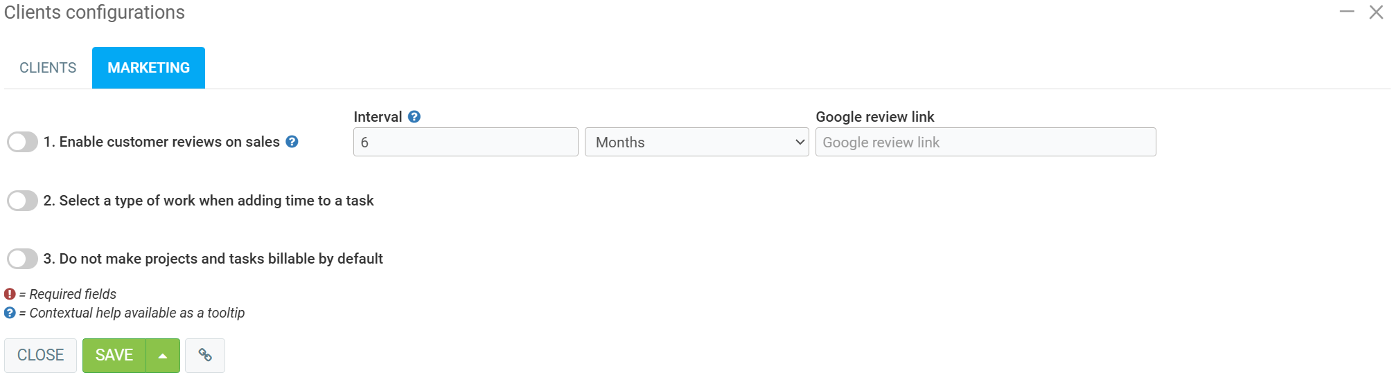 If you want to know the meaning of the box Enable customer reviews on sales, hover over the words and a blue balloon will appear explaining the following: "Following a sale, customers will receive an automatic email asking to review the following links. Make sure you have set up a 'Marketing - Customer Reviews' type email template for this system to work well".