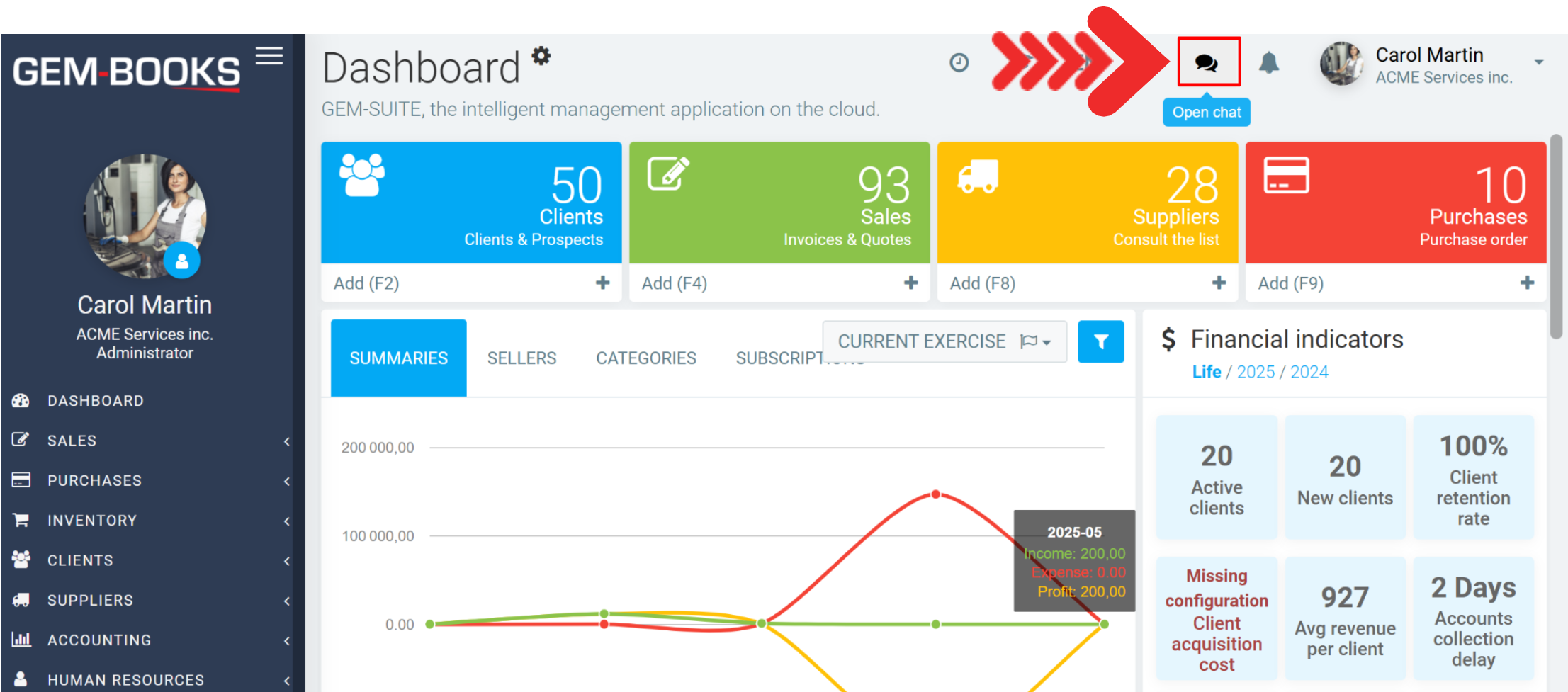 When using the online version, if you receive messages from customers or employees, a small red bullet indicating the number of messages appears in the top right corner of the screen.