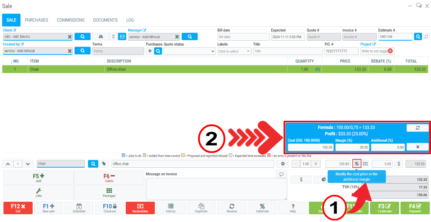 To change the margin on the new product or add an additional margin, click on the percentage button % next to the price in the bottom right corner of the Point of Sale.