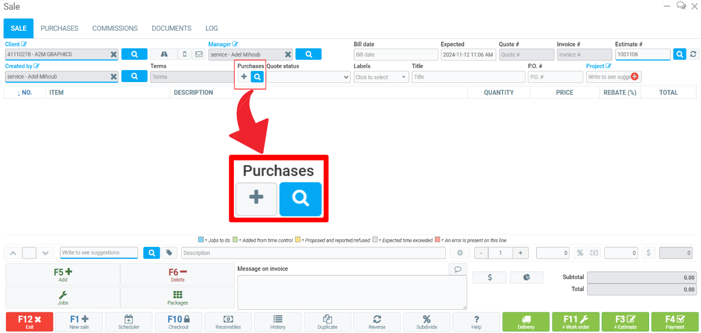 To create a purchase, in the Point of Sale, click on Purchases , between Terms and Quote status.