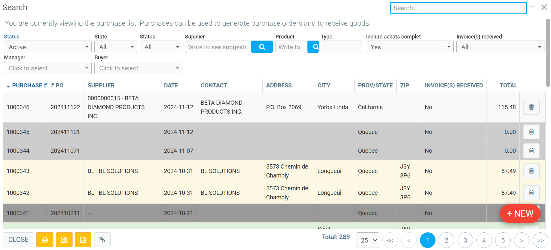 You can select one, search by Status, State, Supplier, Product, Type or create one by clicking on the red +New button.