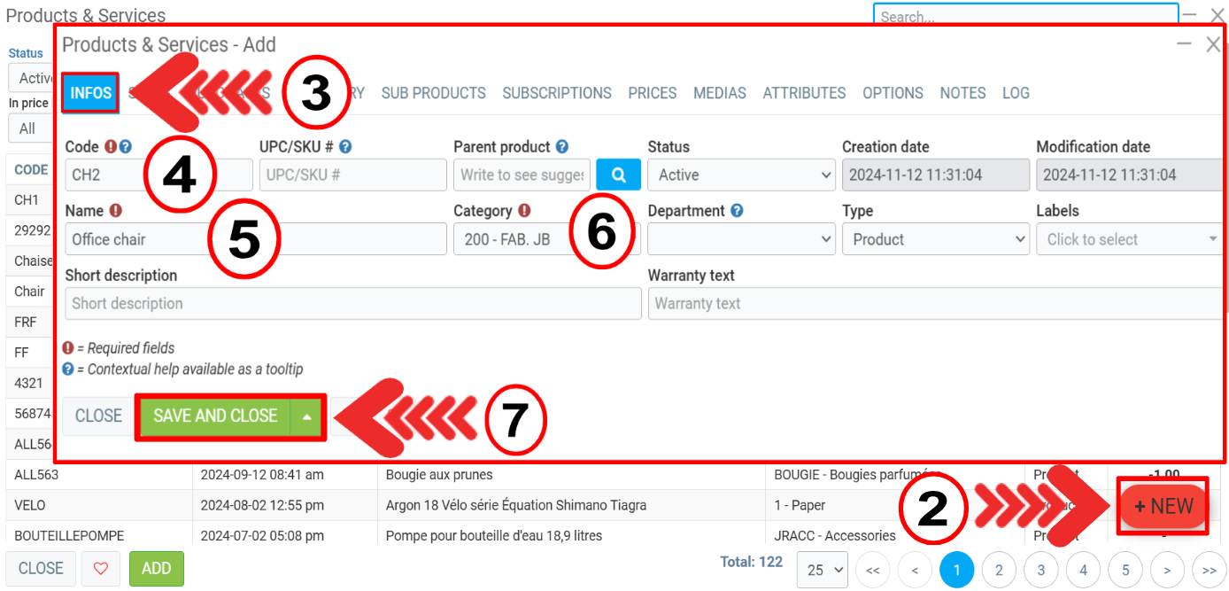 - Product (you can search in the bar on the right of the page, or press the red + key)