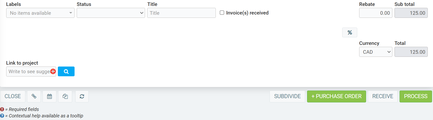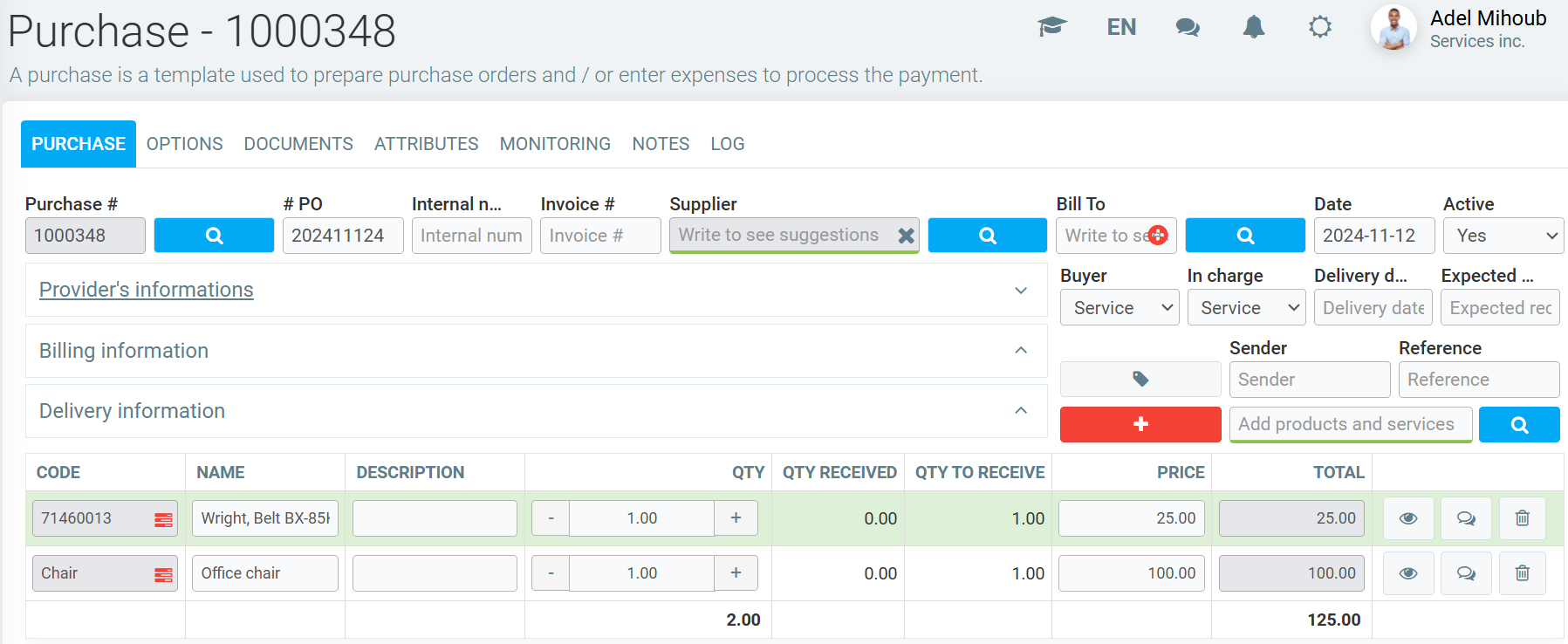 If you choose to create a new purchase, after clicking on the +New button, a new purchase window will open.