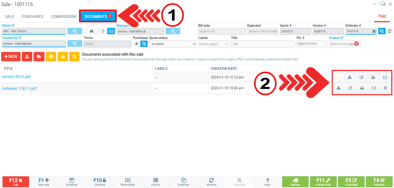 - Delete (available only for estimate and work order).
