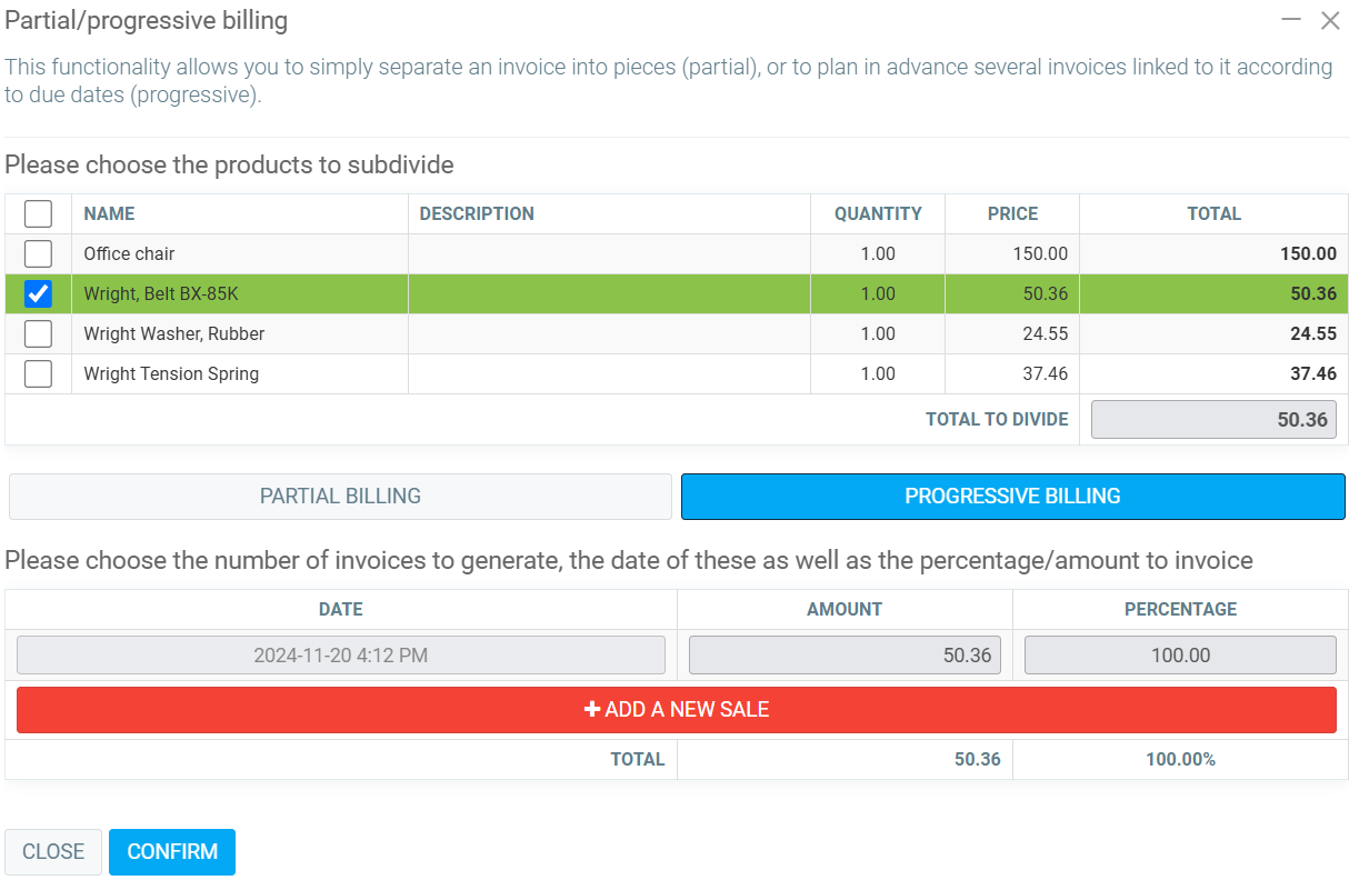 You can also use the Progressive billing button to select the number of invoices to be generated.