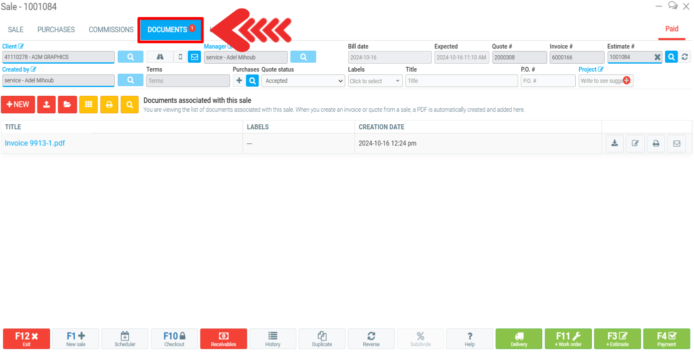 The invoice appears in the Documents tab.
