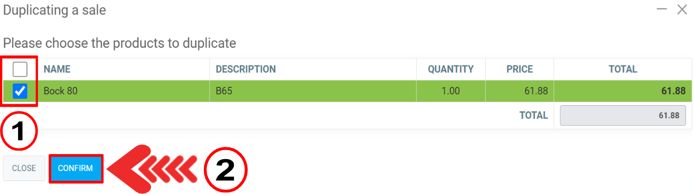 When you click on the icon, a window opens showing the items to be selected to duplicate the sale.