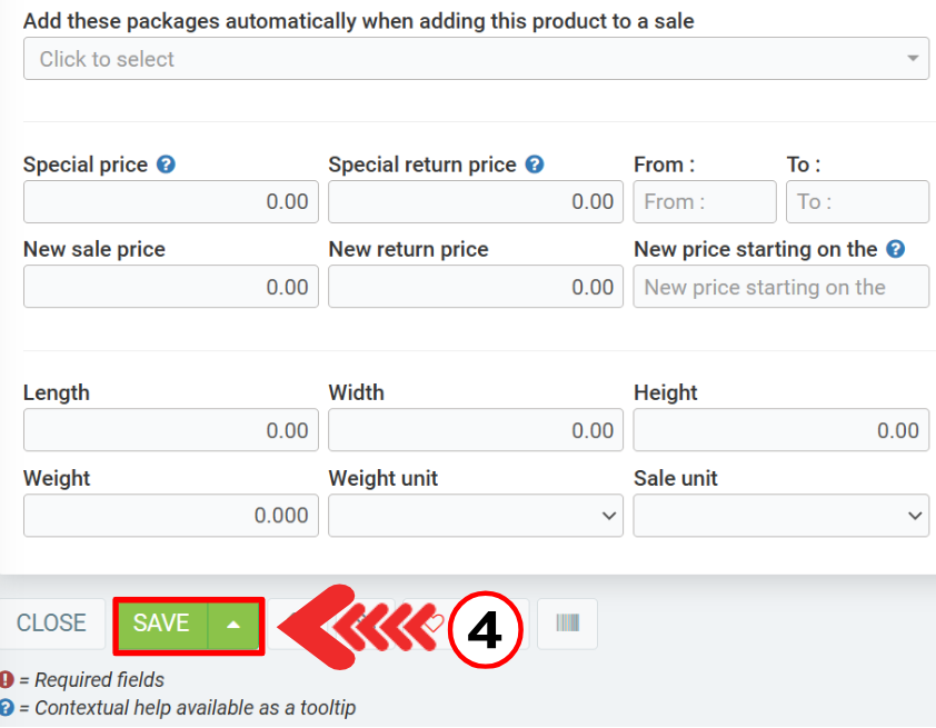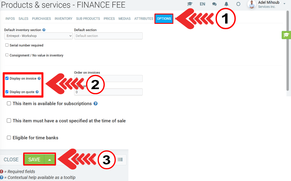 - Check or not the boxes ''Display on invoice'' and ''Display on quote''.