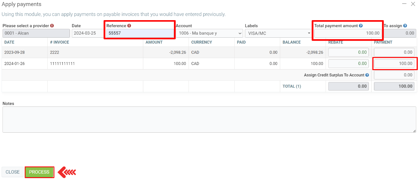 In the next window, select the payment, if there is a discount you can also apply, enter the reference and the total payment amount.