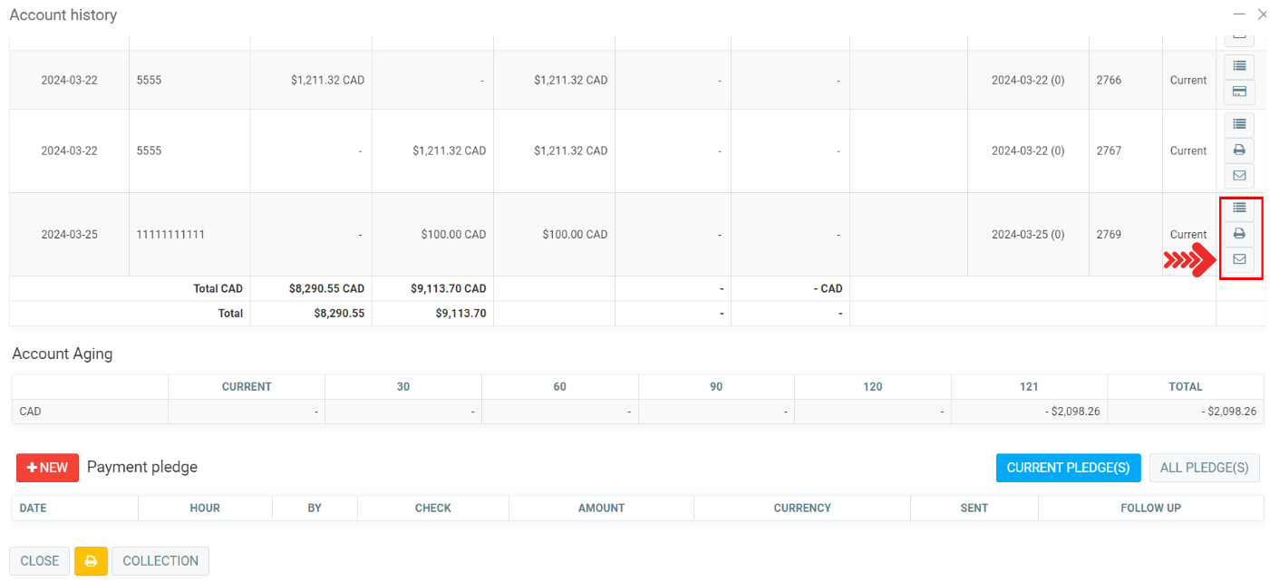 In the account history, next to the transaction, icons allow you to print and send a payment confirmation.