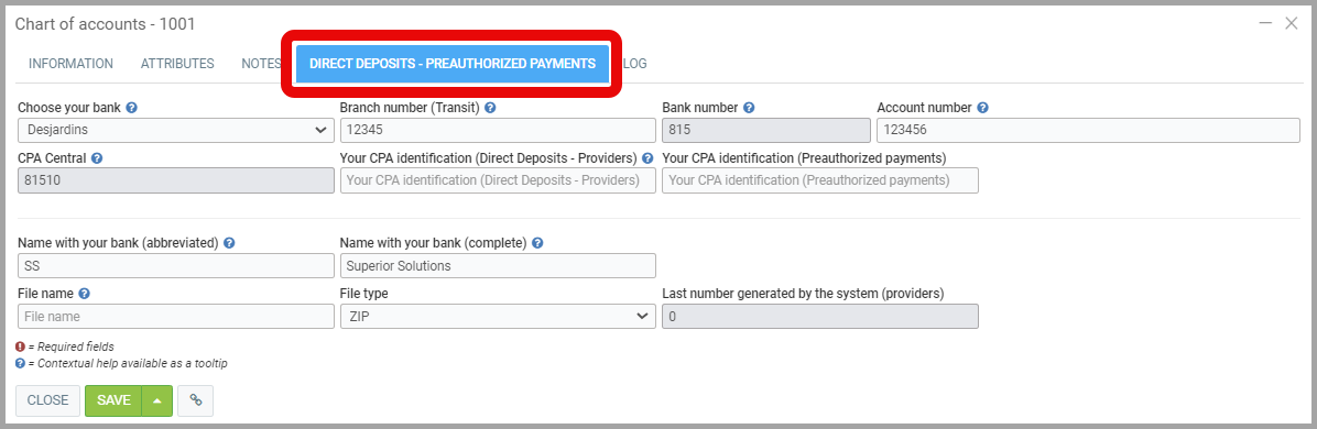 You must enter your bank's ACP Central, this information is automatically entered if you have chosen your bank at the top of the form. In order to use your bank's direct deposit service, you must have subscribed to their services. After your subscription, the bank will provide you with an ACP Central identification number that you will enter in the fields of the same name. If you use the same number for payroll, you can enter it in the multiple fields for this purpose.