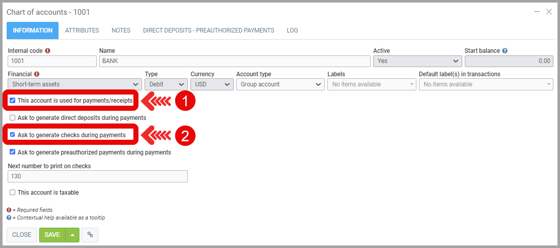 Enable Check Payments: To use this account for check payments, enable the following two options: