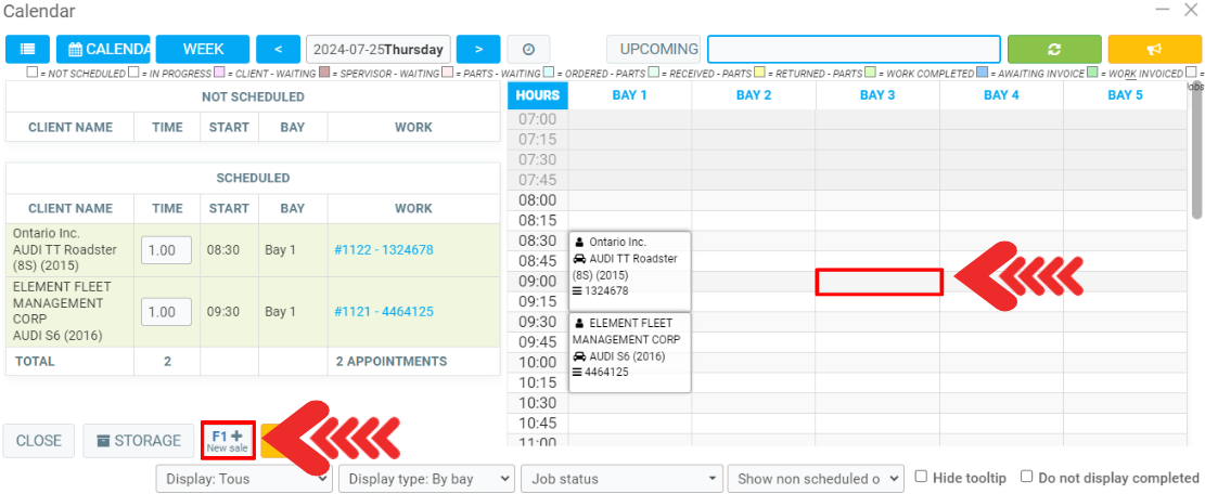 Click on an empty space in your calendar in the desired bay or click on the button F1+ New sale beside the storage button, on the left corner of the page.